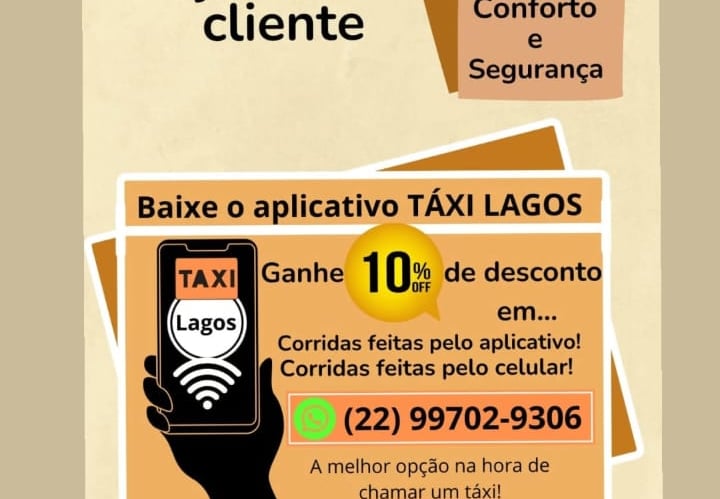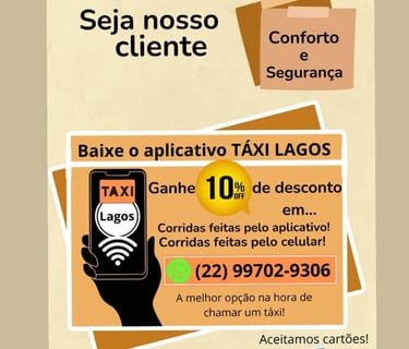 No Táxi Lagos, oferecemos um aplicativo de táxi com 10% de desconto em todas as corridas, garantindo conforto e economia para nossos clientes.